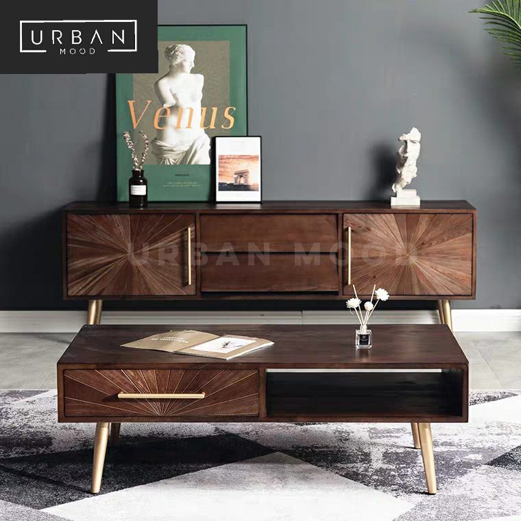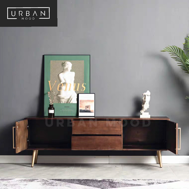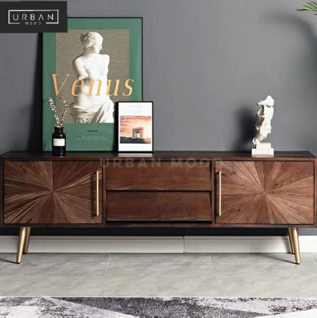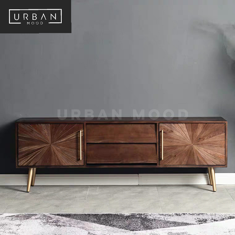 Carefully crafted from solid pine wood and stained a deep shade of walnut, the Brody TV media cabinet adds an urban industrial touch to your modern or rustic living space. This multifunctional unit serves as a sturdy base for any widescreen TVs up to 70 inches, two pullout drawers and two casement doors with starbust wood patterns, behind which lies ample storage space for your media boxes and accessories. Brass legs complete the mid-century look of this stunning accent piece.