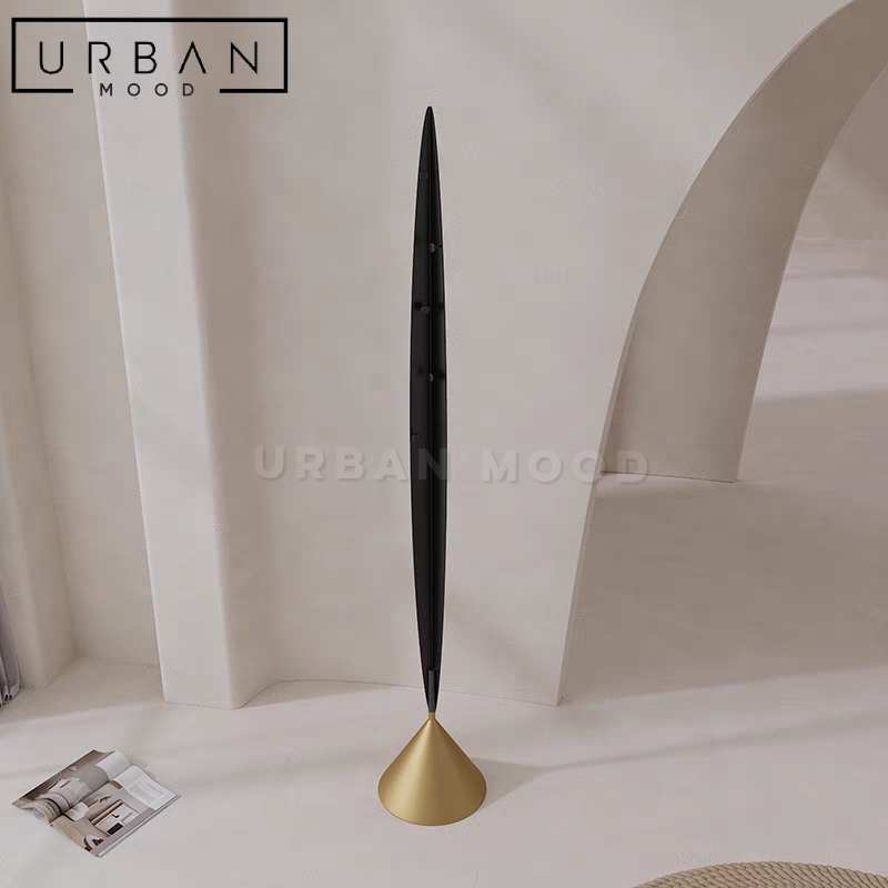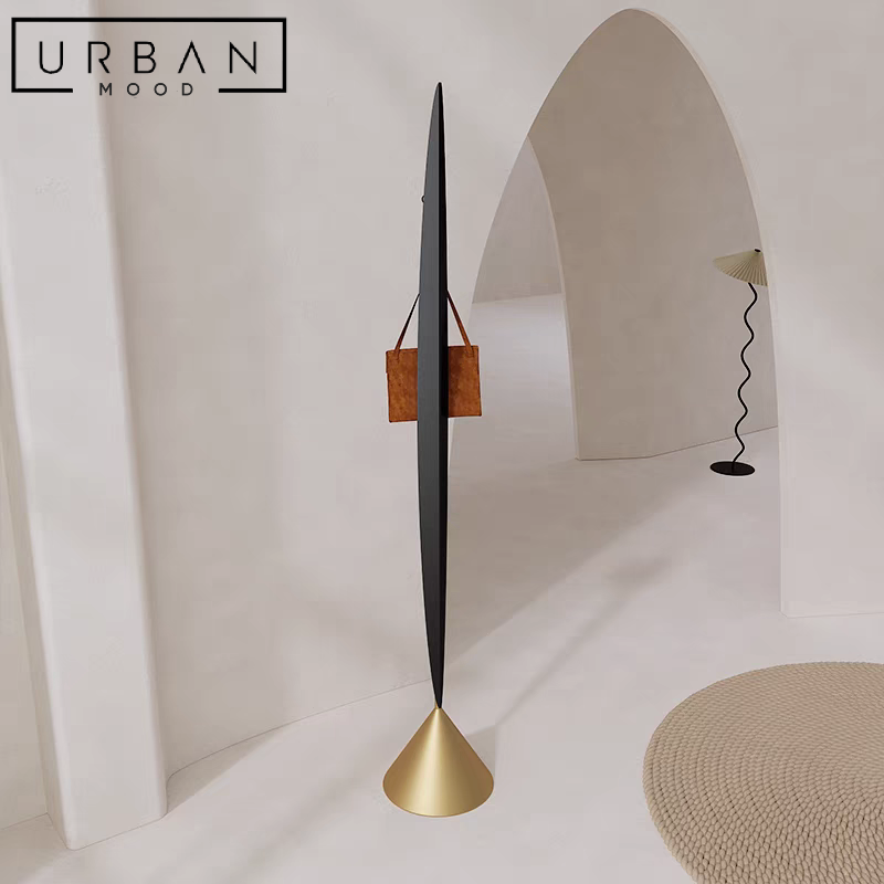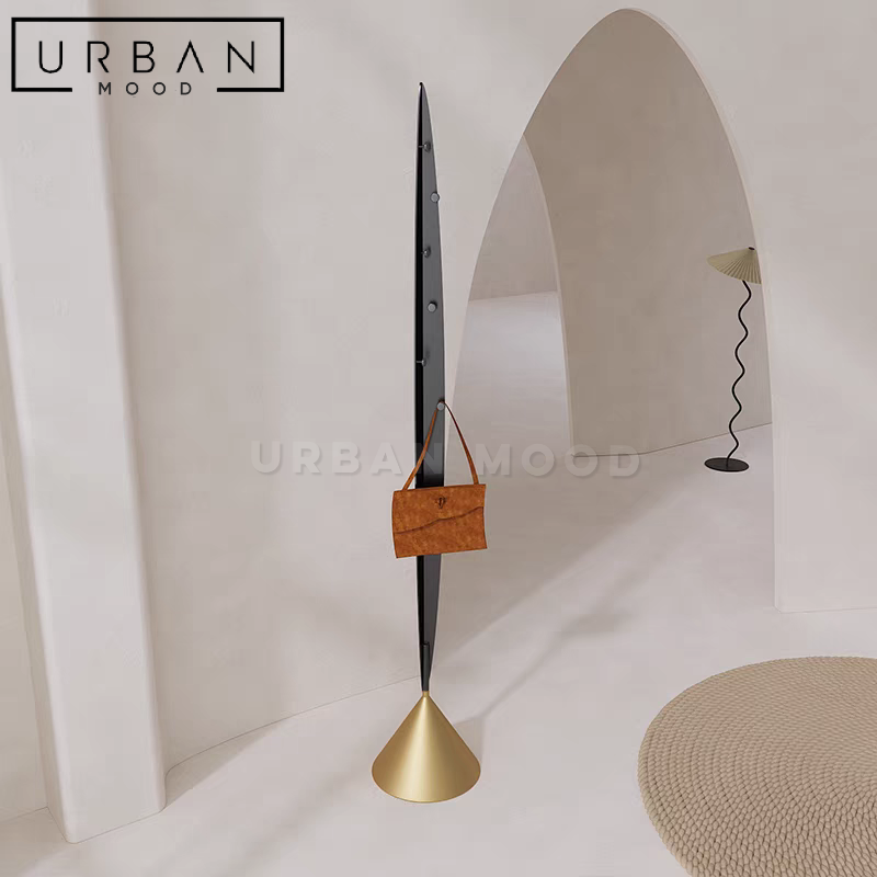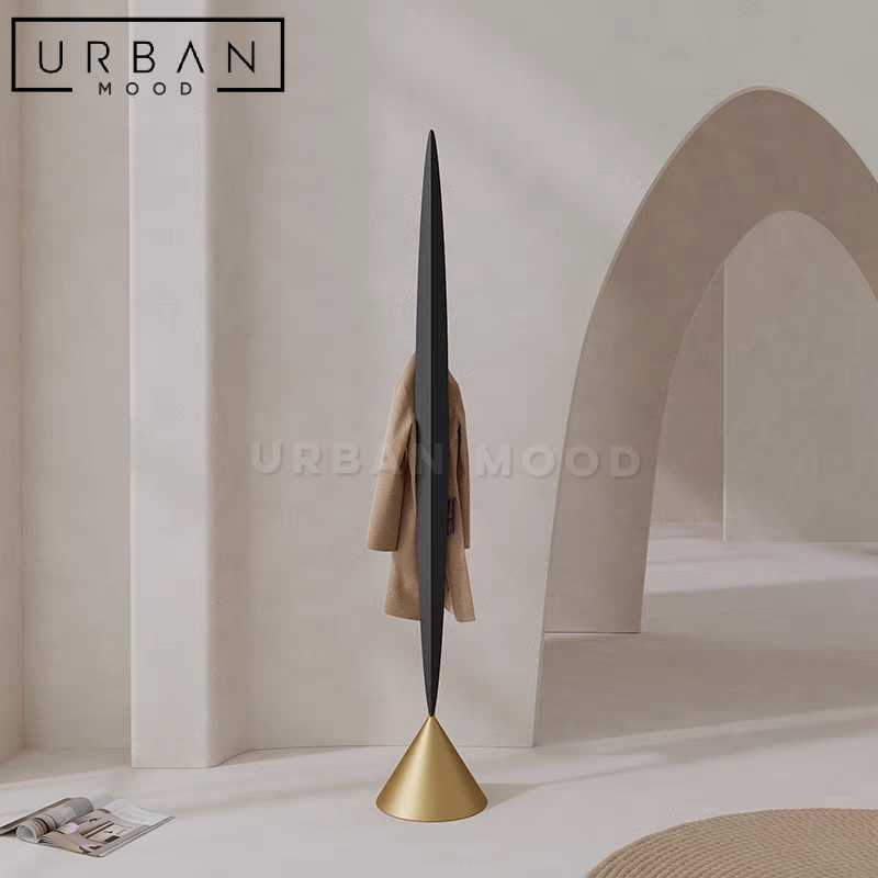 Essential furniture doesn't have to be boring. Spruce up your hallway or closet with our CONRAD clothes stand, featuring a sleek, sharp and tapered metal trunk balanced atop a brass base. Resembling a fountain pen or a skyscraper, this clothes rack will surely be a talking point for friends and guests. Perfect for minimalist, contemporary, or brutalist interior themes.