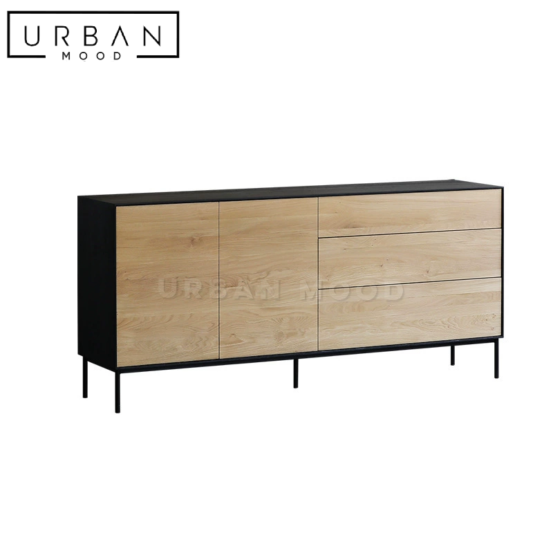 Constructed from solid wood, the FLUSH sideboard features the smooth texture and grains of oak wood, exuding an air of timeless classic. The warm wooden doors open to two tiered shelving for your home office essentials or kitchenware. Founded atop black tapered metal legs and framed by a jet black border, this cabinet makes a strong statement in any modern or rustic living room or dining room.