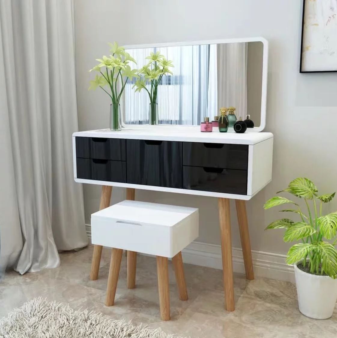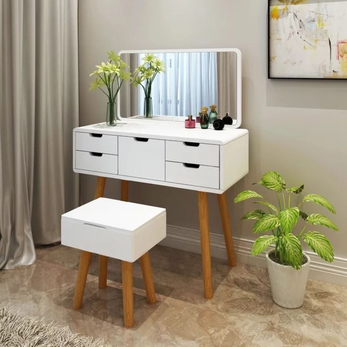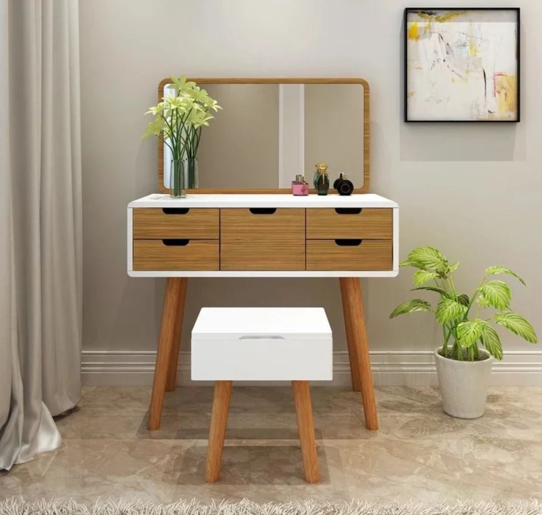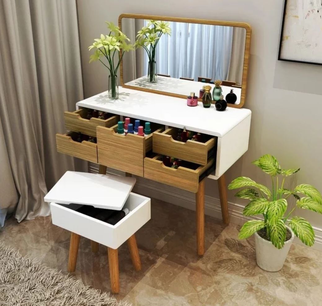 Stow your trinkets and bottles away in the many compartments that come with this vanity table. Even the stool comes in handy with its own storage space!