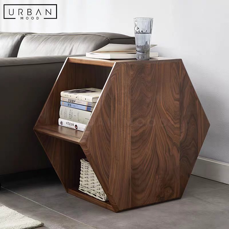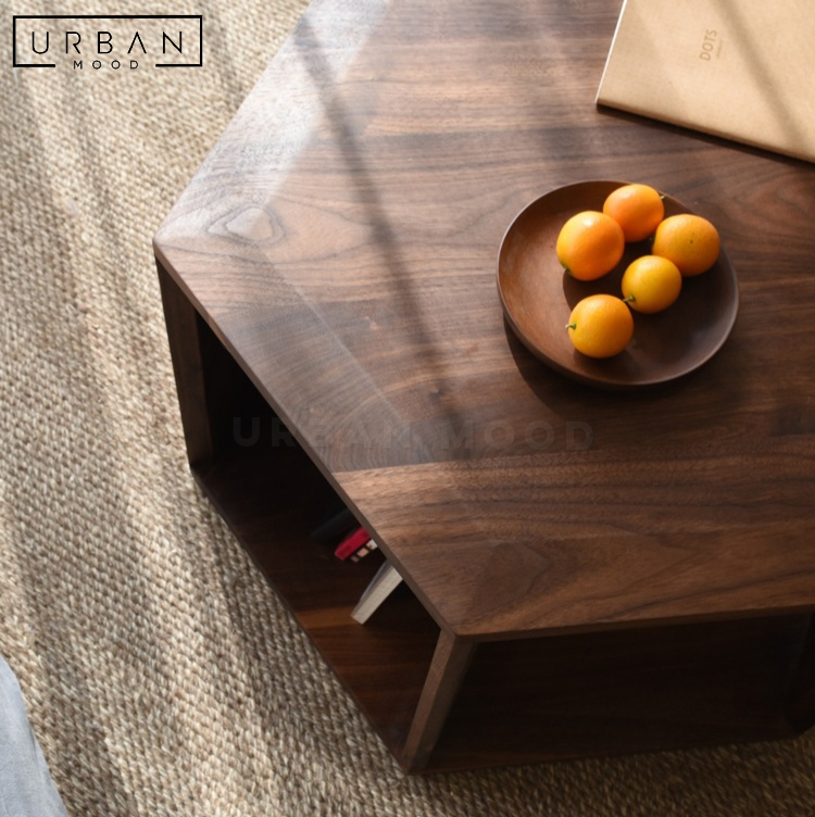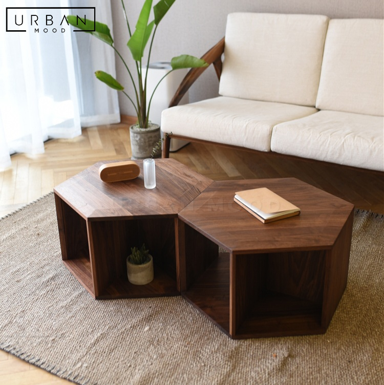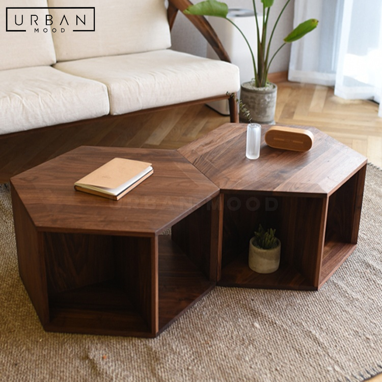 Shape your style with our modular honeycomb-shaped OAKEN coffee table, handcrafted from premium ash wood in a dark walnut finish. Combine multiple units to create a unique centerpiece that adapts to your needs. Each unit boasts a unique hollow shelf beneath, offering storage for your magazines, media accessories, and more. This versatile coffee table invites you to explore endless arrangement possibilities, to complement your modern, rustic, or Japandi interiors.