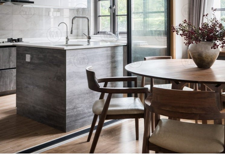 Patrick use remarkable joinery techniques, skilled craftmen workers expertly fit all sections of the solid wood to fashion Scandinavian modern design curves. Showcasing stunning exposed joined details, the dining chair embraces the flows into the armrests. The slim, padded seat perfectly mimics the wooden frame's profile and is neatly upholstered in quality finish. The color contrasts beautifully with the warm color finish of your selection. The Patrick Dining Chair is a exclusive model.