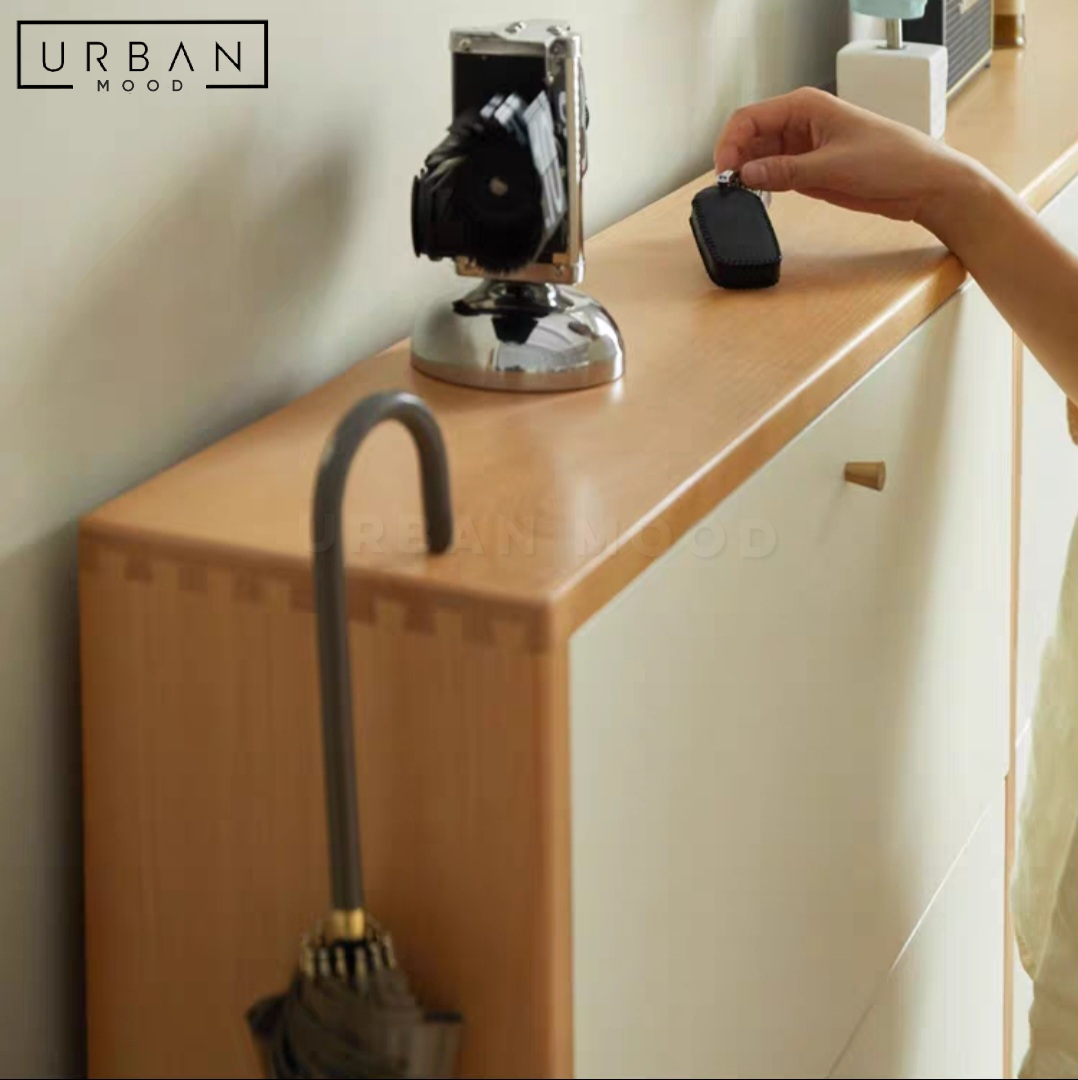 Framed in a warm natural oak border, our RODNEY shoe cabinet features flip doors that reveal ample storage space for your favourite footwear. Its sleek outline and profile allows it to be tucked behind your door without taking up unnecessary floor space, seamlessly concealing your footwear collection. Available in two spacious sizes, the larger cabinet incorporates a foldable bench which can be stowed away seamlessly when not in use. Get organised while optimising space, and add a touch of minimalist charm to your modern or Japandi entryway.