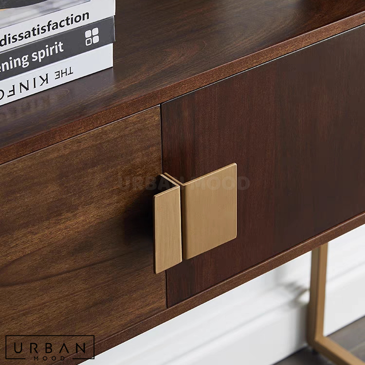 Featuring a clean-lined silhouette and a table crafted from high quality teak, our RONN credenza boasts a rich walnut stain in a matte finish, and metal hardware in a brass finish. Deep slider drawers provide ample room for storage of your daily essentials such as key fobs and wallets, while the spacious table surface allows for display of your frames and collectibles. Complete the look with our DANTE classic windowgrill mirror for a classic or Edwardian vibe.