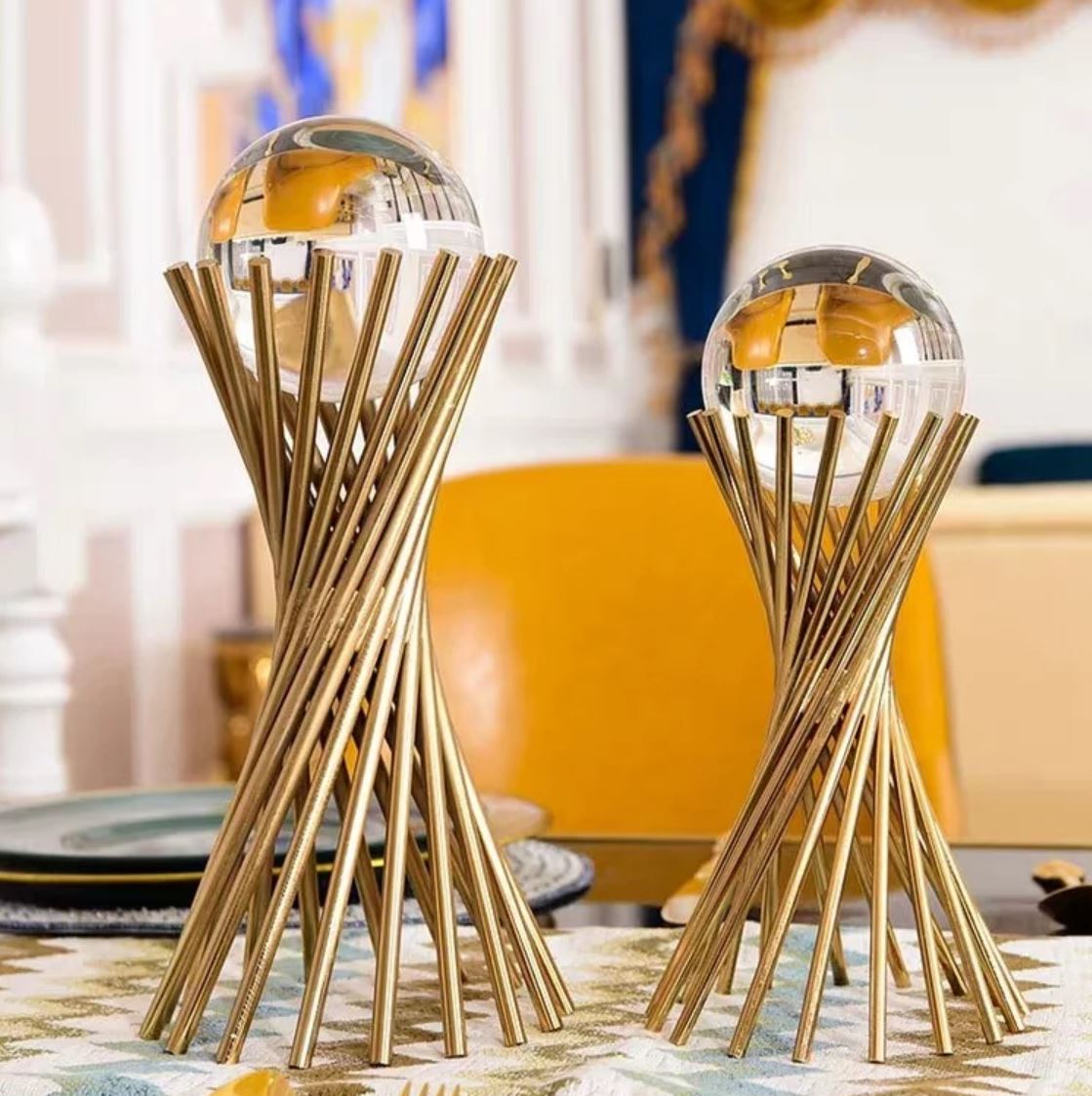 Add a luxurious accent to your home or office desk with our simple and elegant Themis crystal balls. A beautiful sight to behold, the crystal balls are held up by a ring of brass rods and are a wonderful addition to your foyer table, bedside tables, or display shelves.